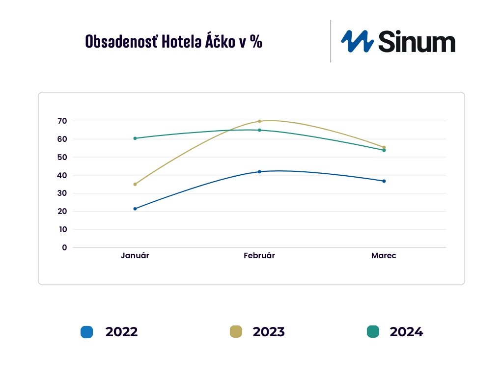 Rok 2023 vykazuje priemernú obsadenosť 53,4% a rok 2024 dokonca 59,7%. Percentuálny nárast obsadenosti medzi rokmi 2022 a 2024 - 44,22%. Toto percento však nezohľadňuje nárast akcií, ktoré hotel zastrešoval deklarovaný majiteľom. Inštaláciou Systému Sinum sa pri vyššej vyťaženosti hotela podarilo dokonca znížiť spotrebu. Majiteľ hotela zároveň zvýšil vnútornú teplotu pre komfort klientov o 1oC, čo v praxi znamená náklady na vykurovanie zvýšené o 6%.
