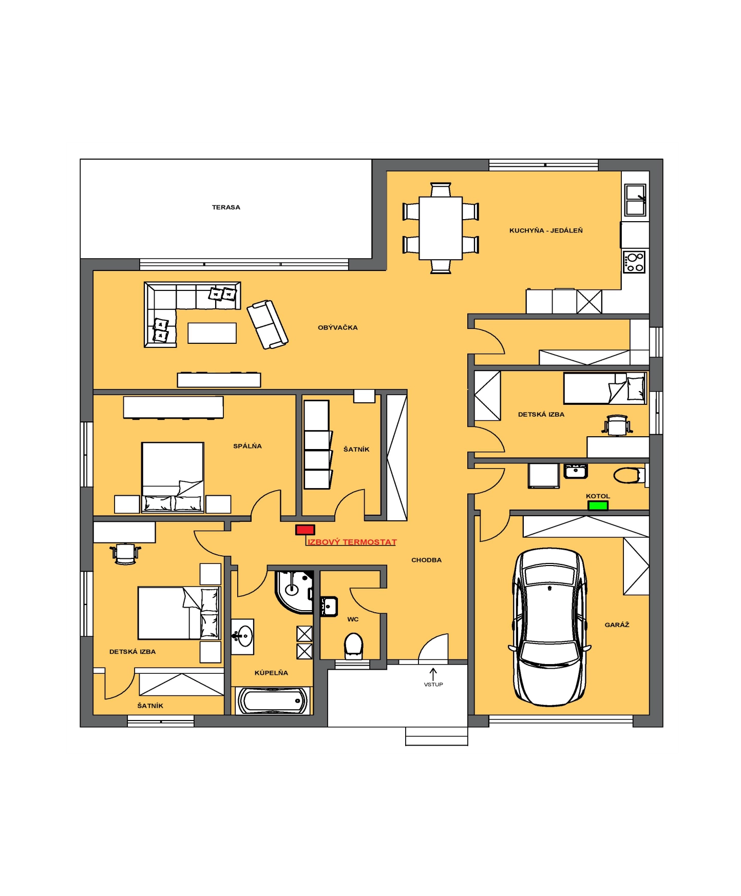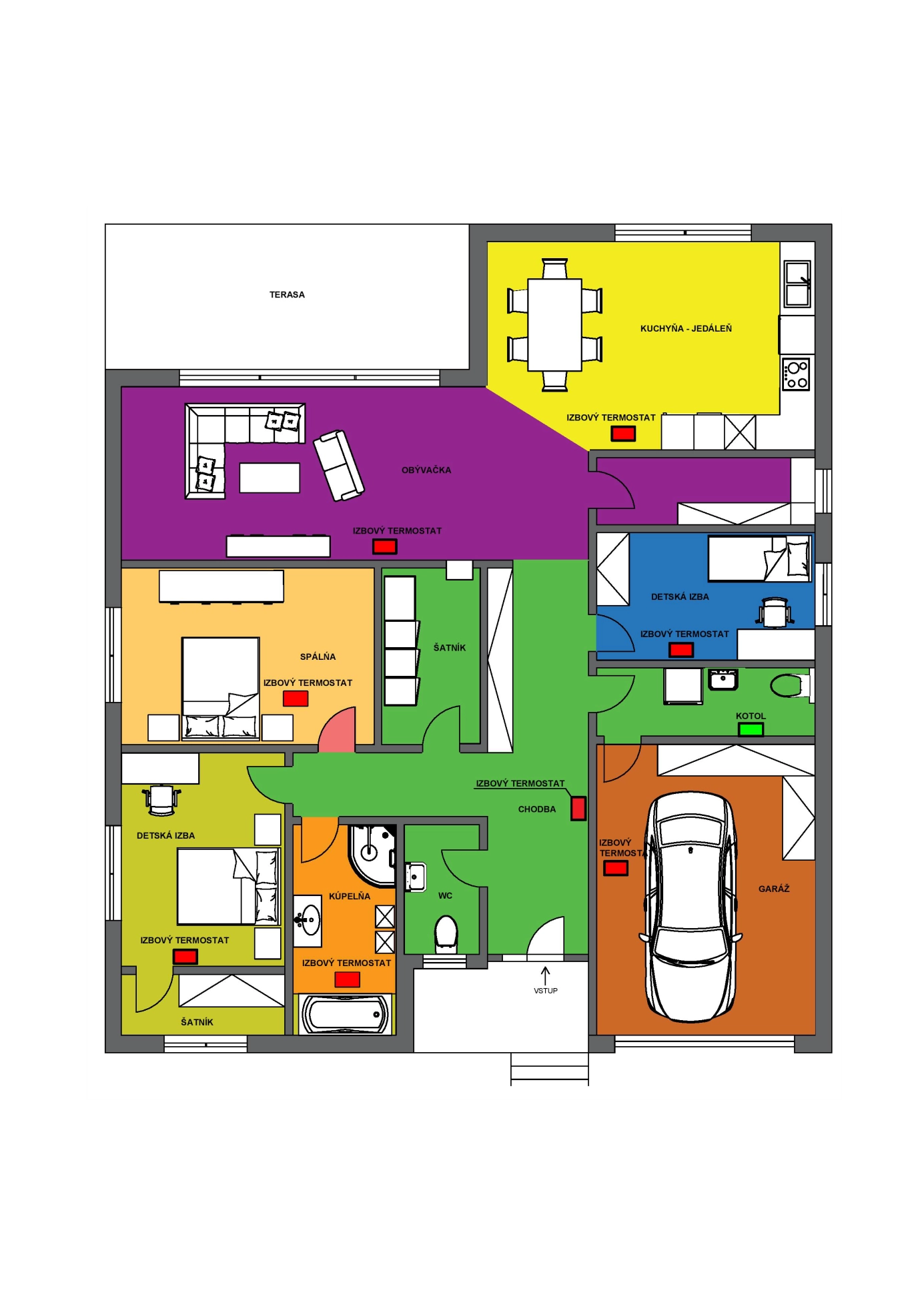 Vykurovanie a regulácia teploty je riadená jedným izbovým termostatom. Priestorová teplota je pre celý dom nastavená konštantne na 22°C/24hod. Umiestnenie izbového termostatu viď na pôdorysnej schéme domu viď obrázok č.1.