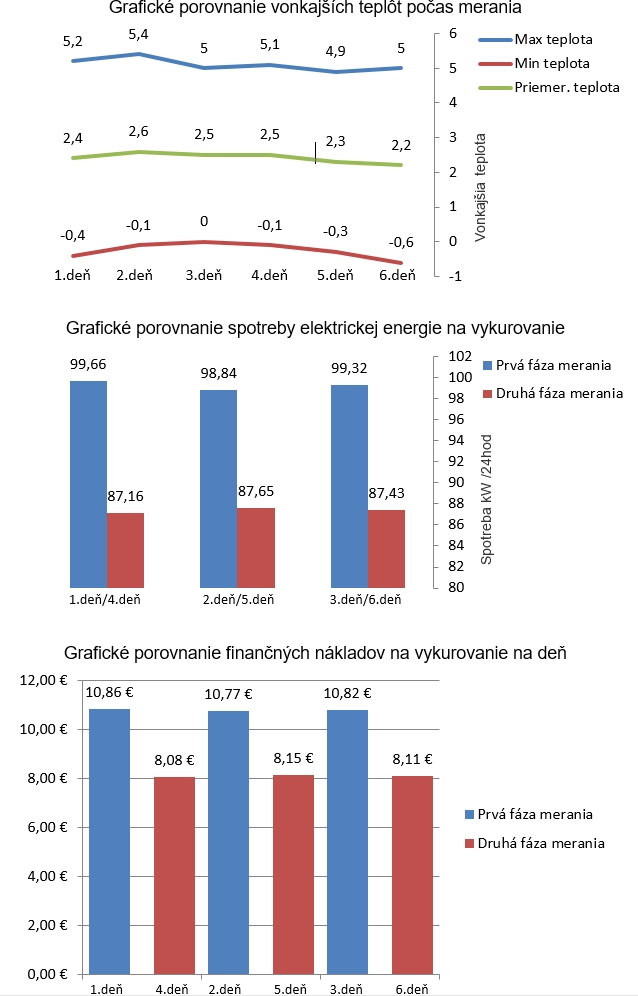 Pri výpočte sme vyhádzali, že dĺžka vykurovacieho obdobia bude trvať 5 mesiacov. Samozrejme takéto hodnoty uvedené v grafoch treba brať s rezervou aj keď sme vychádzali z presne nameraných hodnôt a úspora 25% je reálna. Dôvodom je, že výsledné hodnoty spotreby sú priamo úmerné k vonkajšej teplote, aj keď reálna úspora bude v priemere stále 25%, výsledná hodnota spotreby a finančných úspor bude rozdielna. V našom prípade by nám pri súčasných hodnotách vychádzala mesačná úspora v priemere 81,43 eur čo robí ročne zhruba 405 eur na vykurovacích nákladoch.