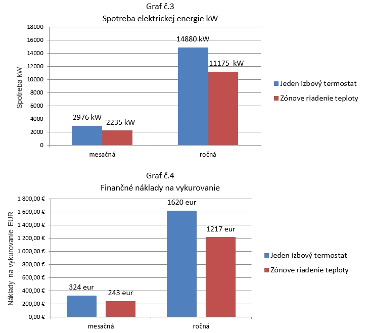 Z porovnania spotreby jednotlivých dní je evidentne vidieť úsporu. Úspora v našom prípade dosiahla v priemere až 25% čo je veľmi zaujímavý výsledok. Keď zoberieme do úvahy súčasne ceny energií, v našom prípade elektrickú energiu, kde pri meraní bola aktuálna cena v tarife DD5 NT=0,1089356 eur, tak denná úspora pri zónovom vykurovaní je v priemere 2,75 eur na deň nižšia ako pri riadení teploty s jedným izbovým termostatom. V nasledujúcich grafoch č.3 a č.4 môžete vidieť mesačnú a ročnú spotrebu a finančné náklady na vykurovanie.