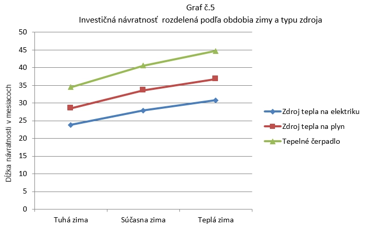 O dĺžke investičnej návratnosti rozhoduje teda primárne spotreba. Samozrejme že výšku vykurovacích nákladov neovplyvňuje len samotná dĺžka vykurovacieho obdobia alebo vonkajšia teplota, ale aj energetická trieda domu a zdroj tepla. Náš meraný objekt je v energetickej trieda A1 a zdroj tepla je 12 kW elektrický kotol, ktorý hrá v prospech rýchlejšej investičnej návratnosti, pretože náklady na vykurovanie pri elektrike sú zhruba o 20% až 50% vyššie ako napr. pri plyne alebo tepelnom čerpadle. Pokiaľ by v meranom objekte bol umiestnený plynový kotol alebo tepelné čerpadlo, investičná návratnosť by sa predlžovala o percentuálny rozdiel úspornejšieho a účinnejšieho zdroja tepla, viď graf č.5. Poslednými faktormi ktoré majú vplyv na veľkosť spotreby a vykurovacie náklady, sú tepelno-izolačné vlastnosti objektu. Čím väčšia tepelná strata objektu, tým väčšia spotreba a náklady, ktoré výrazne skracujú dĺžku investičnej návratnosti.