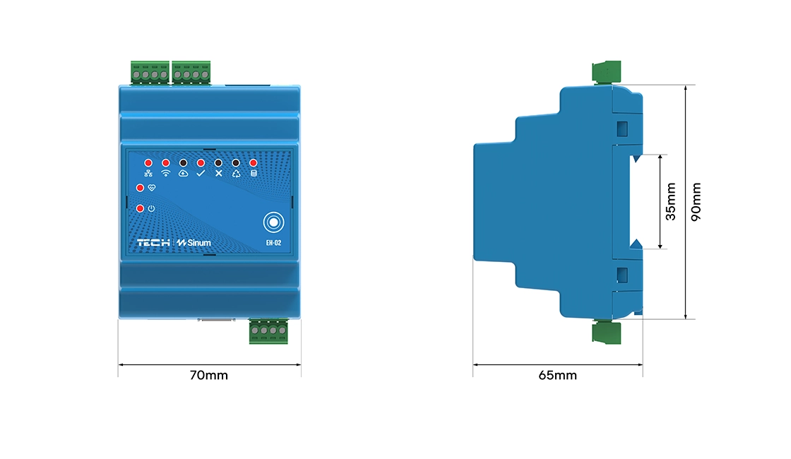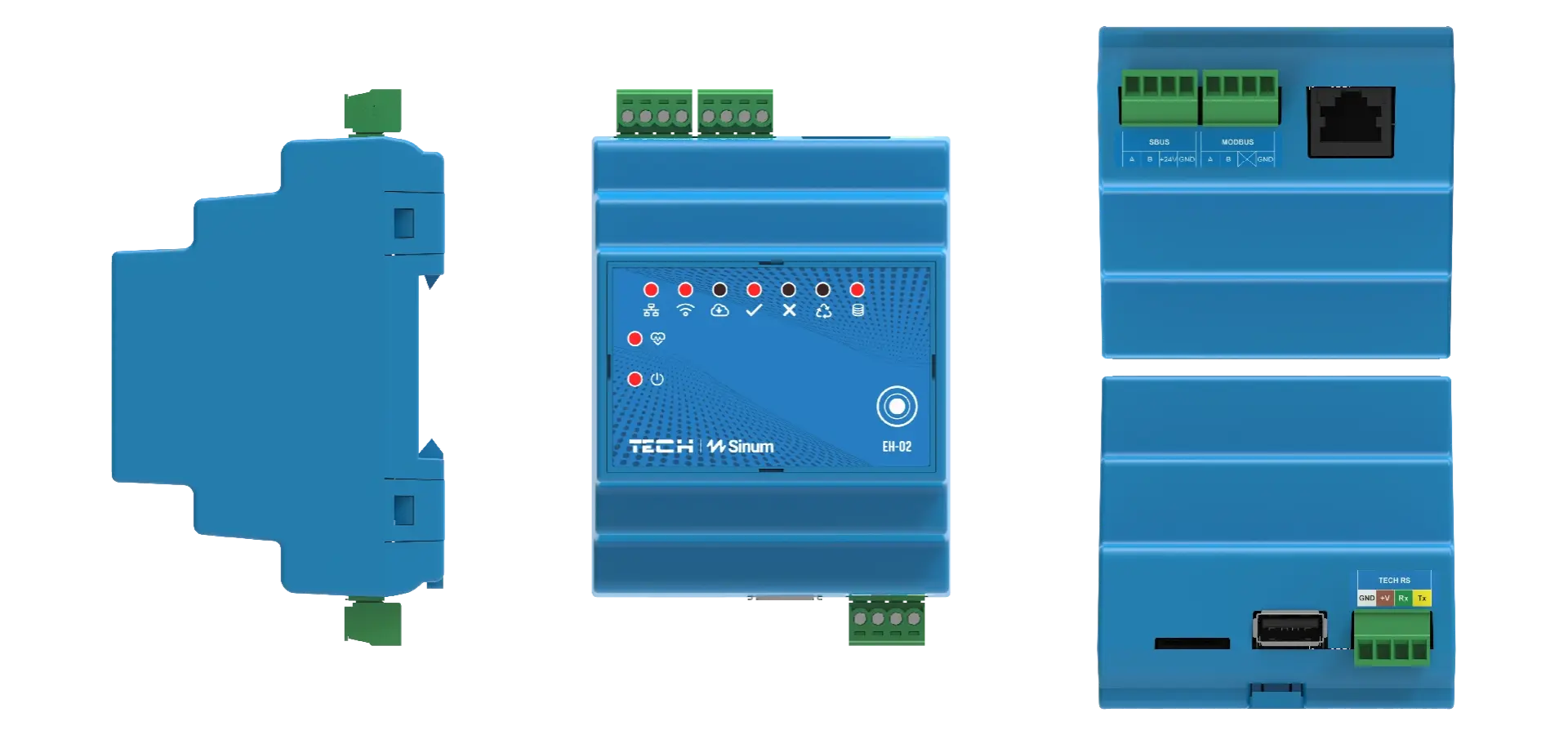 Centrálna jednotka EH-02 je zariadenie, ktoré zbiera a spracováva informácie z externých zariadení a vykonávacích modulov, umožňujúc náhľad a zmenu ich prevádzkového stavu z úrovne domácej siete alebo cez Cloudový prístup.Centrálna jednotka umožňuje tiež vytvoriť automatizáciu založenú na pripojených zariadeniach, ako aj prístup k nim. Umožňuje tiež vytváranie scén a harmonogramov. Inštaluje sa na DIN lištu, napájanie 24 V DC a má vstupy: 1x USB 2.0, slot pre Micro SD kartu, 1x RS-485 (SBUS), 1x RS-485 (MODBUS), sieťové rozhranie RJ-45, Wi-Fi a 1x TECH RS.